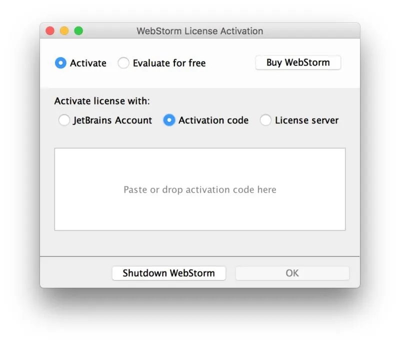 点击获得注册码,打开webstorm,选择Activation code,将注册码粘贴到下面的文本框里,就ok了。