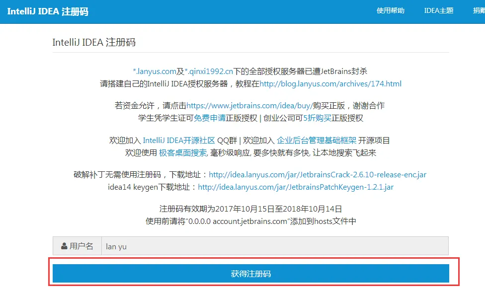 破解网址:http://idea.lanyus.com/ 点进去就是这个页面,有效期到2018年10月14日。