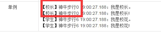 注意了这里第一次调用工厂生成校长实例后,我给校长赋了名称,但是第二次没有,校花也是如此,通常来说第二次没有赋名称应该会显示“匿名”,但由于这里用了单例,在第一次实例化校长(或校花)后我赋值了名称,第二次获取的校长(校花)其实和第一次是同一个实例独享(通俗点就是同一内存地址),因此第二次显示的名称应该和第一次的一样才对;咋们运行看效果: