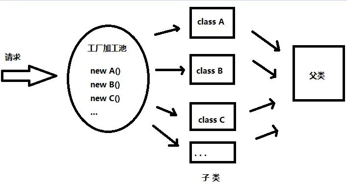 看图能明显看到一个工厂池,这个工厂池作用就是如图所示来创建不同的类型的对象,而这些不同类型的对象通常有一个或一些列相似点,因此这里能提取出来一个基类(或接口),加工池创建对象后直接返回创建的子类(或实现接口的类型),通过暴露父类(接口)提供给调用方想要的对象,这种做法使得调用方在使用工厂模式的时候,不需要关注具体对象,只需要关注暴露的父类(接口)即可,这就是工厂模式的好处;
