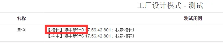 1 var SingltonLog = new StringBuilder(string.Empty); 2 var p0 = simpleFactory.GetPeople(FactoryPattern.SimpleFactory.EmPeople.校长); 3 p0.Name = "神牛步行0"; 4 SingltonLog.AppendFormat("{0}", p0.Say("我是校长。")); 5 var p00 = simpleFactory.GetPeople(FactoryPattern.SimpleFactory.EmPeople.校长); 6 SingltonLog.AppendFormat("{0}", p00.Say("我是校长!")); 7 8 var p6 = simpleFactory.GetPeople(FactoryPattern.SimpleFactory.EmPeople.校花); 9 p6.Name = "神牛步行6"; 10 SingltonLog.AppendFormat("{0}", p6.Say("我是校花。")); 11 var p66 = simpleFactory.GetPeople(FactoryPattern.SimpleFactory.EmPeople.校花); 12 SingltonLog.AppendFormat("{0}", p66.Say("我是校花!")); 13 14 ViewBag.SingltonLog = SingltonLog;
