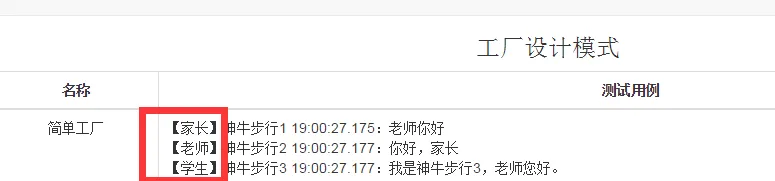 1 var sbSimpleFactoryLog = new StringBuilder(string.Empty); 2 3 SimpleFactory.MoSimpleFactory simpleFactory = new SimpleFactory.MoSimpleFactory(); 4 var p1 = simpleFactory.GetPeople(FactoryPattern.SimpleFactory.EmPeople.家长); 5 p1.Name = "神牛步行1"; 6 sbSimpleFactoryLog.AppendFormat("{0}", p1.Say("老师你好")); 7 var p2 = simpleFactory.GetPeople(FactoryPattern.SimpleFactory.EmPeople.老师); 8 p2.Name = "神牛步行2"; 9 sbSimpleFactoryLog.AppendFormat("{0}", p2.Say("你好,家长")); 10 11 var p3 = simpleFactory.GetPeople(FactoryPattern.SimpleFactory.EmPeople.学生); 12 p3.Name = "神牛步行3"; 13 var say3 = p3.Say(string.Format("我是学生{0},老师您好。", p3.Name)); 14 sbSimpleFactoryLog.AppendFormat("{0}", say3); 15 ViewBag.SimpleFactoryLog = sbSimpleFactoryLog;