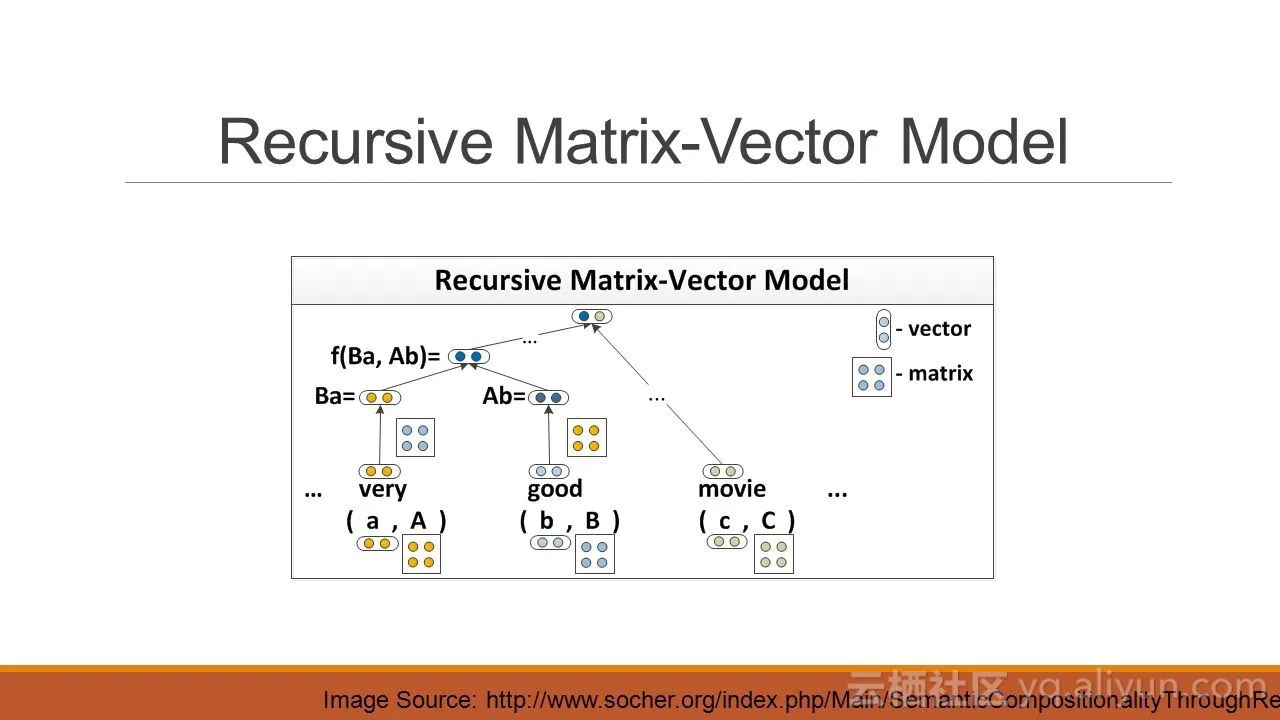 另一个演变是Matrix-Vector RNN,它能够捕获更长短语的组成含义。该模型为解析树中的每个节点分配一个向量和一个矩阵:向量用于捕获成分的固有含义,而矩阵捕获它如何改变相邻单词或短语的含义。而且该矩阵向量RNN可以在命题逻辑和自然语言中学习运算符的含义。