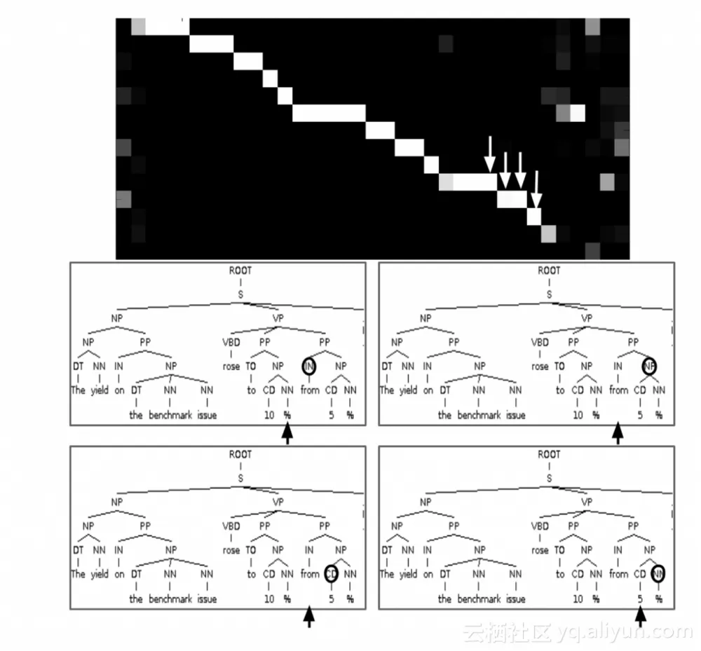 在语法作为外语中,作者使用具有注意力机制的递归神经网络来生成句子解析的树。可视化的注意力矩阵可以深入了解网络如何生成这些树:
