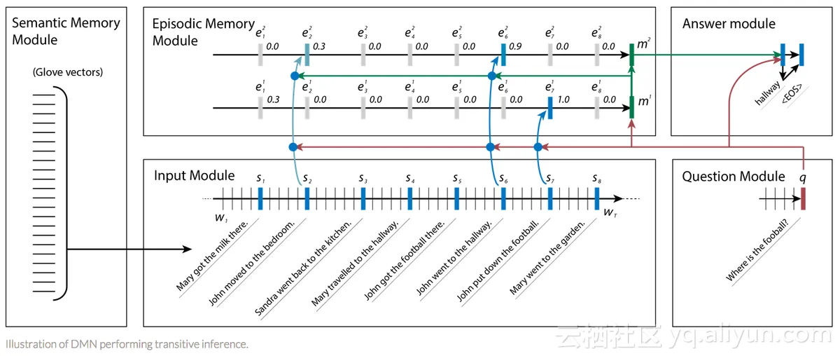 强大的深度学习架构(称为动态内存网络(DMN))已针对QA问题进行了专门开发和优化。给定输入序列(知识)和问题的训练集,它可以形成情节记忆,并使用它们来产生相关答案。该体系结构具有以下组件: