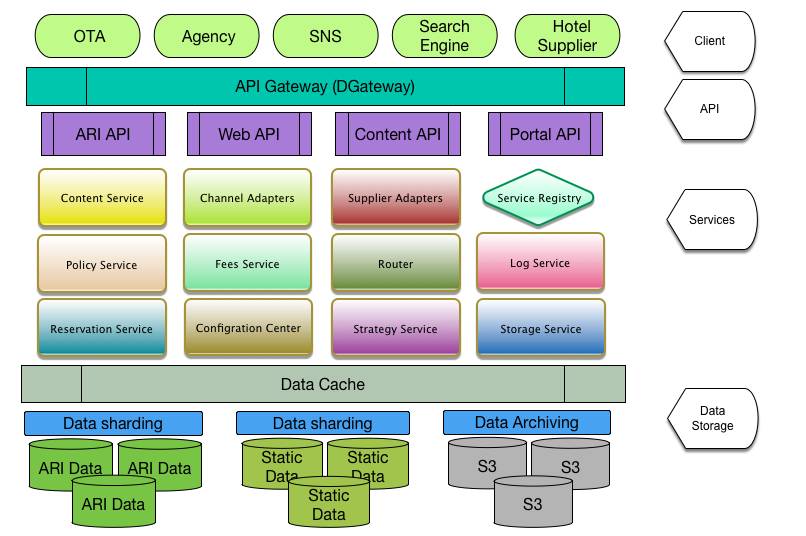 数据对接平台的架构⼤体上分三个层次,最外⾯是 API 层,由 API Gateway 和各业务的 API 服务组成,中间层是服务层,平台的⼤部分的功能在这层实现,服务之间通过依赖或组合,可以组成功能更强的服务,最底层是存储层服务,由缓存层和存储层组成。