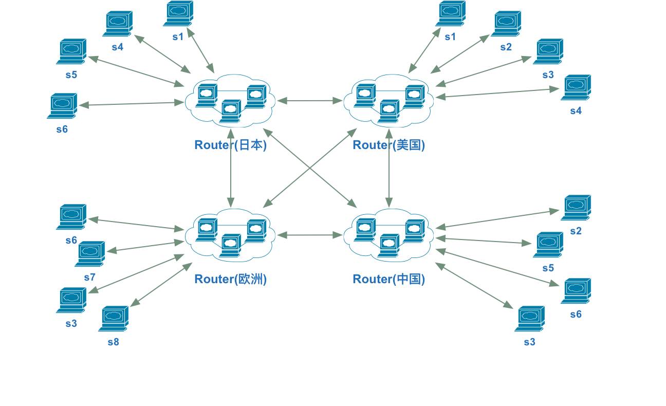 上⾯的服务依赖是不是很乱?我们的服务节点分布在全球 14 个可⽤区⾥,⼤部分在 AWS 上,⼩部分在⾃建的私有云⾥,可⽤区之间的服务有复杂的依赖关系。为了解决这种情况下服务之间的依赖调⽤问题、 API 安全问题和服务的⾼可⽤问题,我们设计开发了路由服务,解耦服务的调⽤者和提供者,简化⽹络拓扑图,简化服务器的安全配置。引⼊路由之后,服务之间的依赖关系简化为如下图所示: