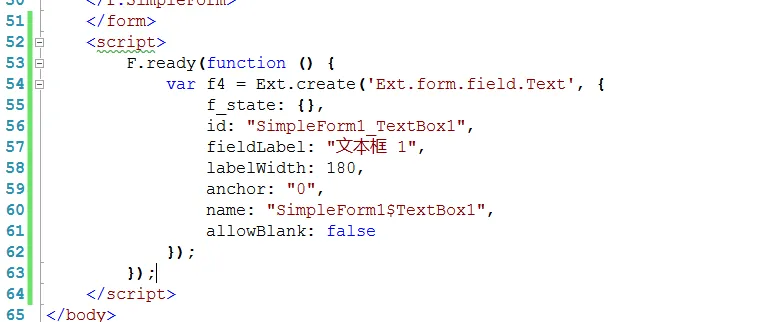 F.ready(function () { var row = Ext.create('Ext.form.field.Text', { f_state: {}, fieldLabel: "自己喜欢的", labelWidth: 180, anchor: "0", name: "SimpleForm1$TextBox1", allowBlank: false }); });