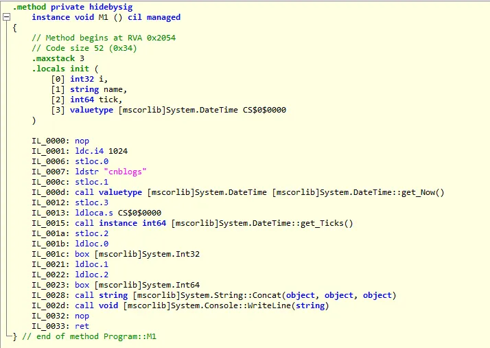 1 void M1() 2 { 3 Int32 i = 1024; 4 String name = "cnblogs"; 5 Int64 tick = DateTime.Now.Ticks; 6 Console.WriteLine(i + name + tick); 7 }