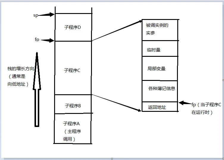 上图中的调用顺序是A-B-C-D。sp(栈指针)总是指向栈上第一个未使用的位置,而sp(帧指针)指向当前子程序的帧的已知位置。帧图中的各种信息的排列顺序仅供参考,因为各各语言的编译器的实现或许会有不同的顺序安排。栈的维护是由子程序的调用序列来维持的,其中各种子程序内部所需的对象会随着调用而创建、结束调用而销毁。编译时虽然不能确定帧的位置,但是对其中各各对象的偏移量则是可以做出安排的。如下面的代码: