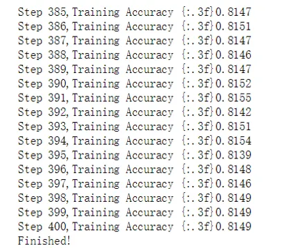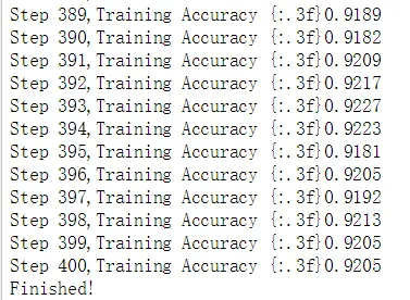 最后我们利用测试集的数据检验训练的准确率,feed_dict填充的数据分别是测试集的图片数据和测试集图片对应的标签。输出结果迭代次数和准确率,完成训练过程。我们截取400次的训练结果,如下图所示: