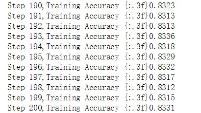 print("Step " + str(step) + ",Training Accuracy "+ "{:.3f}" + str(acc))