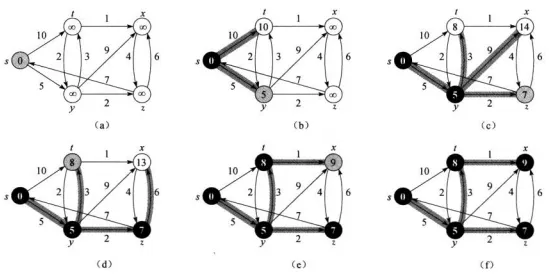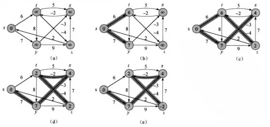 如图所示每一次松弛边的顺序都是(t,x) (t,y) (t,z) (y,x) (y,z) (z,x) (z,s) (s,t) (s,y)。源结点为s,加了阴影的边表示前驱路径。