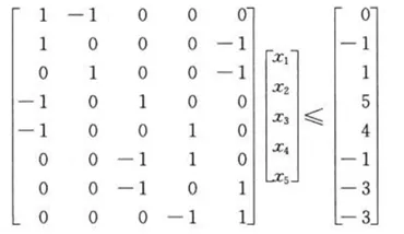 如图所示的矩阵和向量可以表示为8个简单不等式,要求出一组可行解。以x作为结点,后面的约束值作为路径权重,可以画出一张约束图