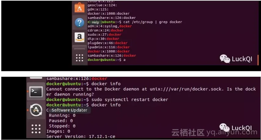 但是这个安装好之后我们可以发现 使用sudo 可以使用 docker命令 ,但是我们使用普通用户的时候就没法使用了,那应该怎么办呢?我们可以把权限发送给我们的普通用户组,操作步骤如下