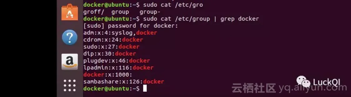 cat /etc/group | grep docker //这个是过滤的docker用户组 内容跟上面的图 比 已经加上的我自己的用户 权限