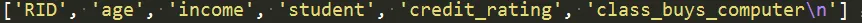 headers=str(allElectronicsData.readline()).split(',') #读取信息头文件