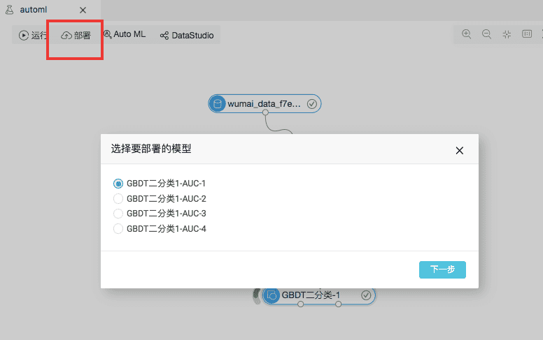 生成了模型,可以在PAI平台一键将模型发布成API服务。只要点击部署按钮,就会列出当前实验可部署的模型,选择需要的模型就可以一键完成部署,是不是很简单。
