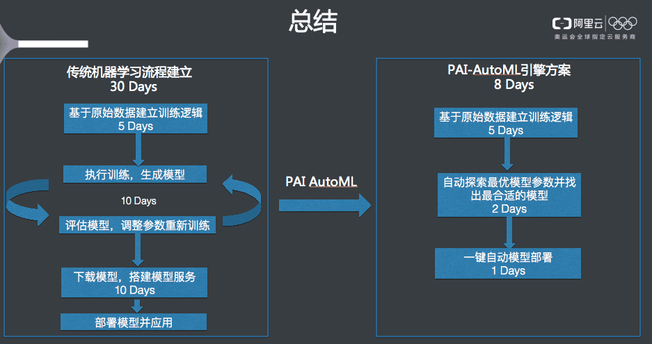 PAI AutoML引擎拟在最大限度上减少机器学习业务搭建成本,目前上线的模型训练参数调优和模型一键自动部署服务已经在节约人力开销方面提供帮助。未来PAI平台还会在这个方向继续投入,真正做到让机器学习不再是个高门槛技术,让人工智能触手可及。