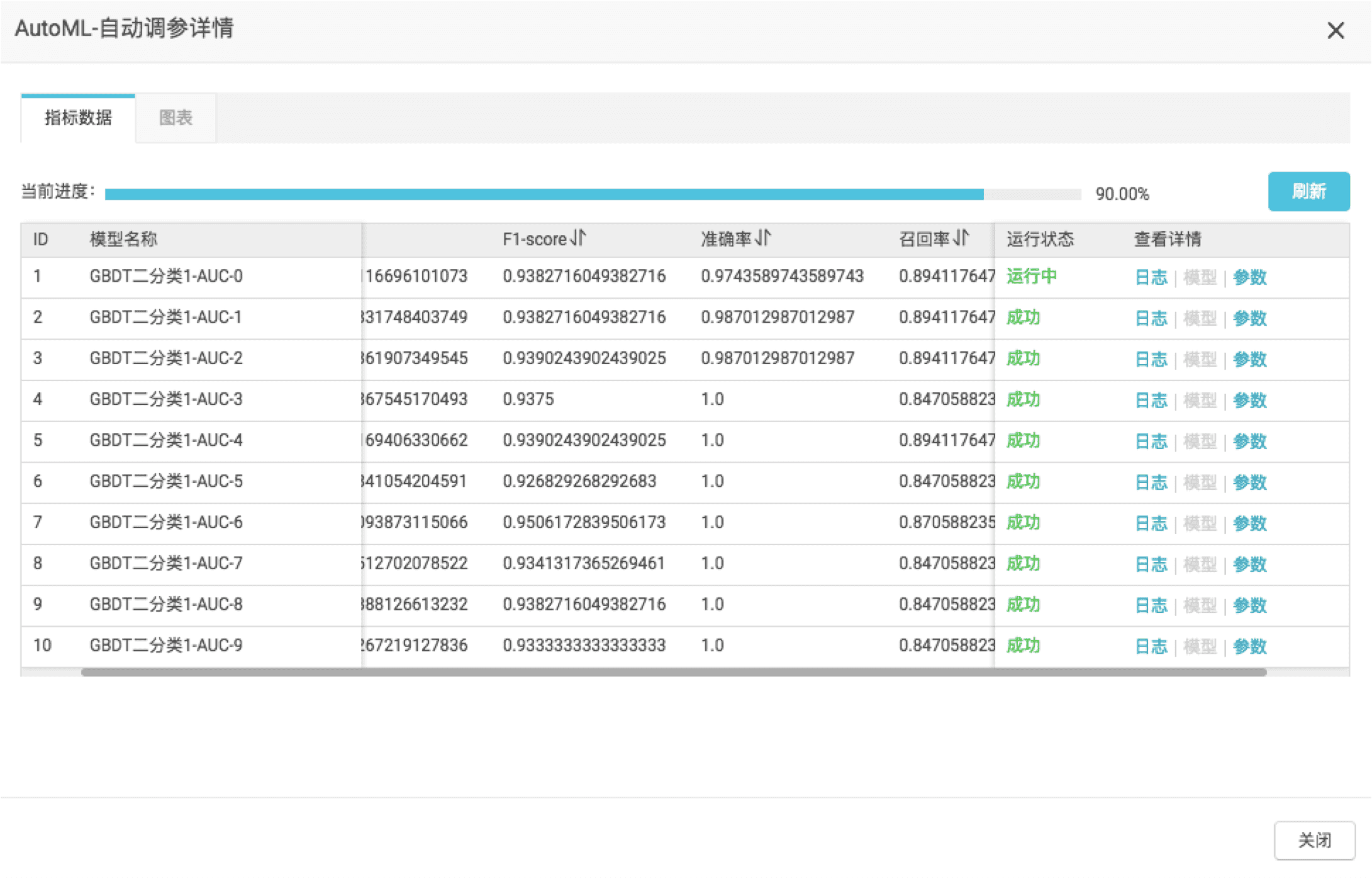 PAI AutoML提供多维度的算法评估方法,只要在F1Score、Precision、Recall、AUC中选择自己所需要的评估指标,系统会自动完成模型评估工作并将服务下发到下游的训练环境,所有评估流程完全不需人工参与。