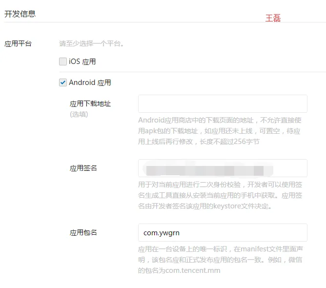 1.微信开放平台申请移动应用(需要缴纳300元/年费用),配置开发信息,应用包名和签名一定要填对,如图: