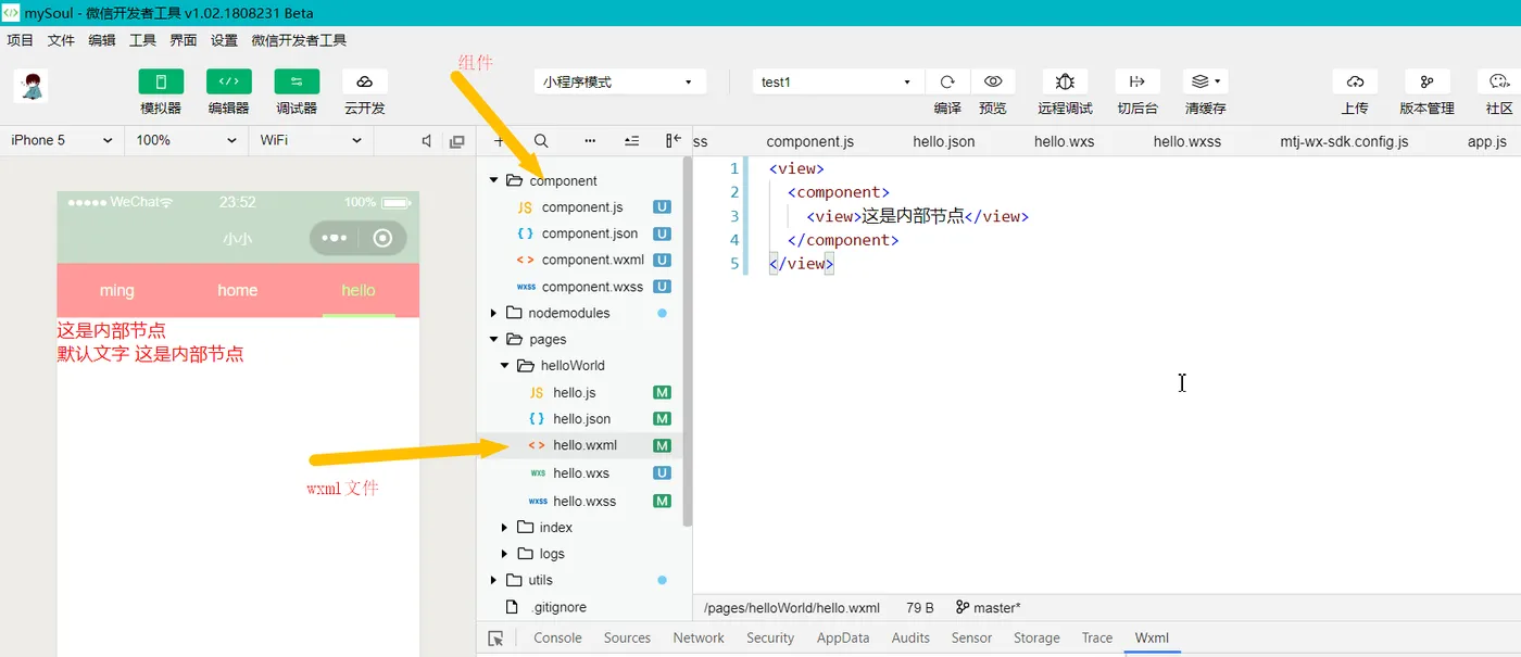 组件模板的写法和页面模板相同,组件模板和组件数据组合生成节点树。将被插入到组件的引用位置上。