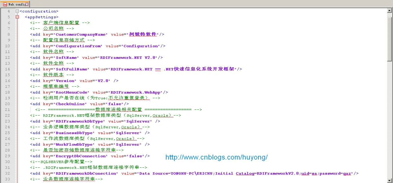 Web版本配置相当的简单,配置项写在了Web.config文件中,配置项的含义与配置的方法可以参考WinForm的Config.xml文件的相关说明,各配置项的含义一至,如下图所示。
