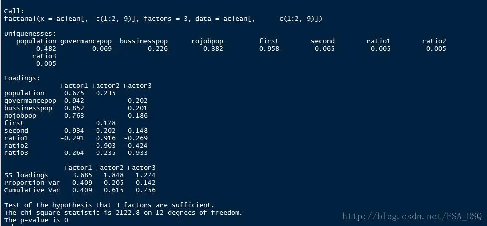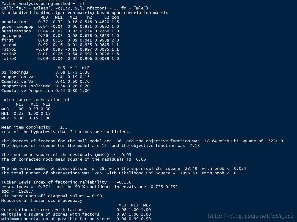 r是相关系数矩阵或原始数据矩阵;nfactors设定提取的因子数(默认为1);n.obs是观测数(输入相关系数矩阵时需要填写);rotate设定放置的方法(默认互变异数最小法);scores设定是否计算因子得分(默认不计算);fm设定因子化方法(默认极小残差法)。