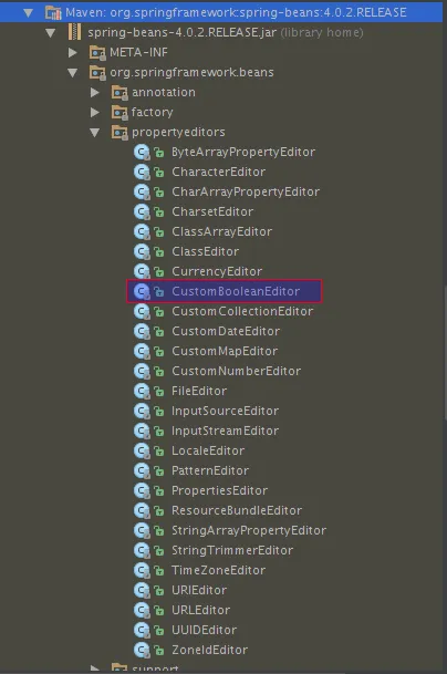 spring中也有继承了PropertyEditorSupport并重写了setAsText的自定义的属相编辑器,都在spring-beans包下的org.springframework.beans.propertyeditors包里: