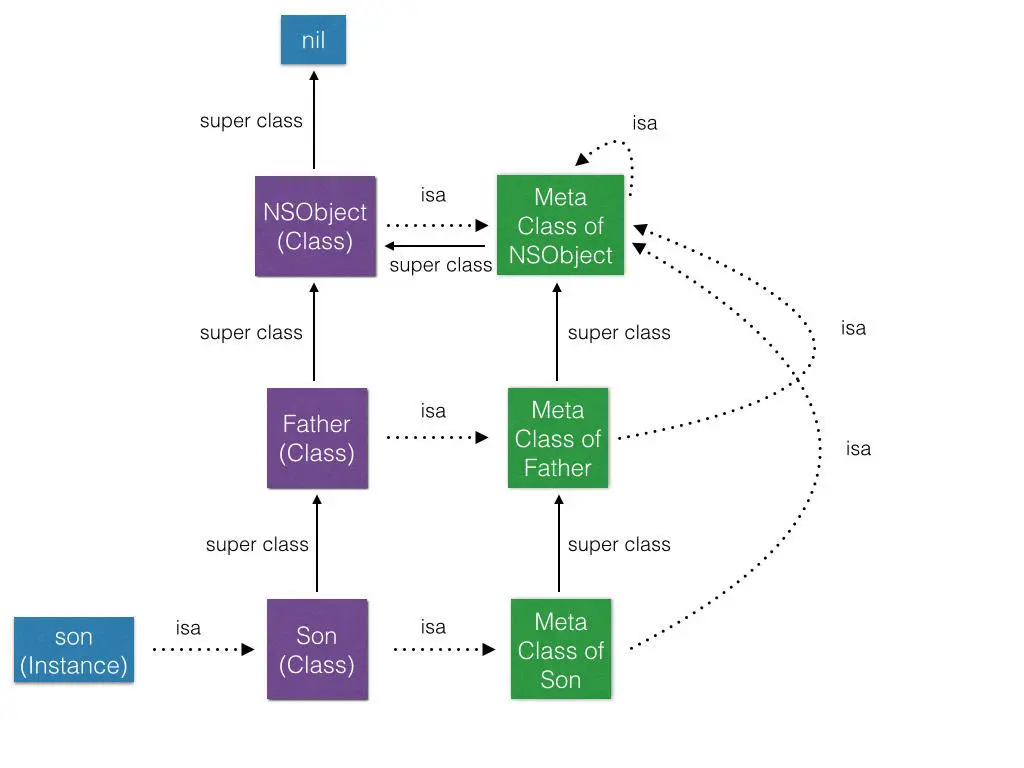 - 当我们发送一个消息给一个类时,这条消息会在类的Meta Class的方法列表里查找
