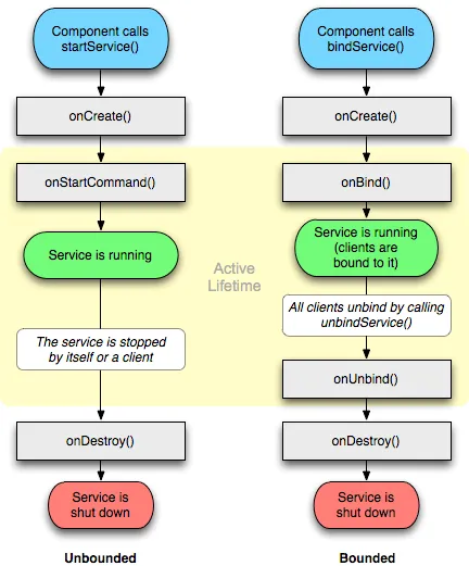 context.bindService()->onCreate()->onBind()->Service running--调用>onUnbind() -> onDestroy() 从上诉可以知道分别对应本地的,,以及远程的,也对应不同的方式启动这个服务。