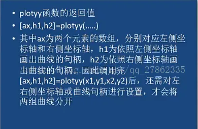 plotyy(x1,y1,x2,y2,Fun1,Fun2):以左右不同的纵轴分别以Fun1,fun2指定的形式绘制x1-y1和x2-y2两条曲线