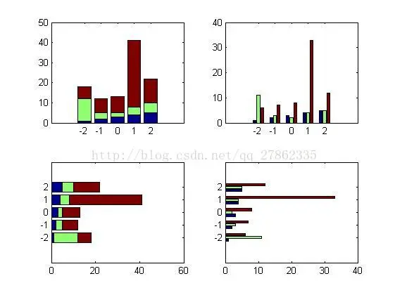 bar(x,y):在指定的横坐标x上画y,其中。x为严格单调的向量,如果y为矩阵,则bar函数分解为几个行向量,在指定的横坐标处分别画出。(注意:此时,x向量的长度必须和矩阵y的行数相同)