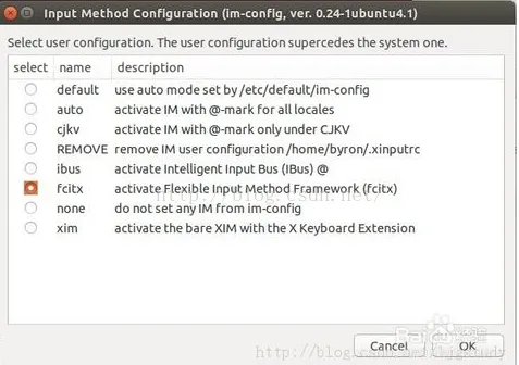 接下来就是在终端中输入im-config,这时会出现一个对话框,点击OK,有一个对话框,点击Yes,你会看到下面的对话框。如果上面是fcitx,就不用管,直接关闭;如果不是,就修改上面的ibus为fcitx.点击OK即可。又会出现一个对话框,接着就是OK,最后重启电脑。