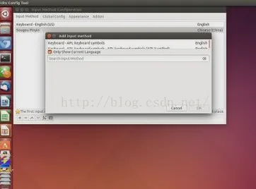 之后,在终端中输入:fcitx-config-gtk3出现对话框如下。点击对话框左下角的(+)按钮,弹出另一个对话框如上图所示。然后,取消Only Show Current Language(很重要,否则不能找到刚安装过的搜狗输入法!)最后,在输入框中输入sogou,选中点击OK即可。添加完后将其放置到列表的最下方,注意,是最下方!!!然后默认输入法就是搜狗输入法了。