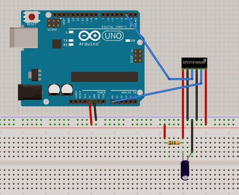 该模块具有非常低的电流消耗(最大20mA,11毫安典型值),最高7VDC供电。传感器的输出是一个模拟电压成正比的测量粉尘密度,具有0.5V/0.1mg/m3的灵敏度。