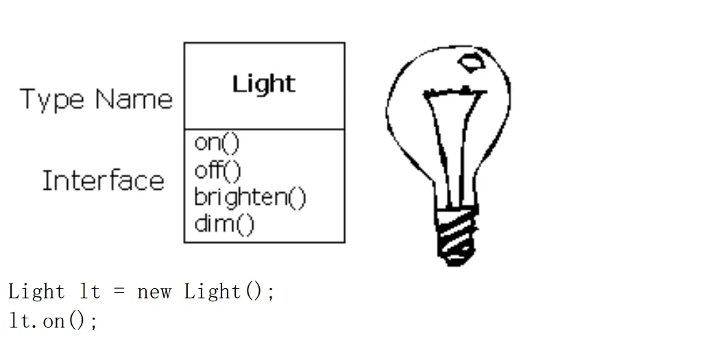 在这个例子中,类型/类的名称是 Light,可向 Light 对象发出的请求包括包括打开( on)、关闭( off)、变得更明亮( brighten )或者变得更暗淡( dim)。通过简单地声明一个名字( lt),我们为 Light 对象创建了一个“句柄”。然后用 new 关键字新建类型为 Light 的一个对象。再用等号将其赋给句柄。为了向对象发送一条消息,我们列出句柄名( lt),再用一个句点符号( .)把它同消息名称( on)连接起来。从中可以看出,使用一些预先定义好的类时,我们在程序里采用的代码是非常简单和直观的。