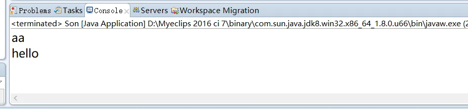 1 package oop; 2 3 public class Son extends Father{ 4 public Son(String name) { 5 super(name); 6 // TODO Auto-generated constructor stub 7 } 8 @Override 9 public void getname() { 10 System.out.println("aaaaaaaaaaaaaaaaaaaaaa"); 11 } 12 }