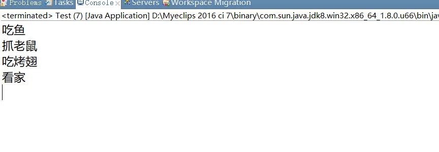 1 package oop; 2 3 abstract class Animal { 4 abstract void eat(); 5 } 6 7 8 9 package oop; 10 11 public class Cat extends Animal{ 12 13 @Override 14 void eat() { 15 // TODO Auto-generated method stub 16 System.out.println("吃鱼"); 17 } 18 public void work(){ 19 System.out.println("抓老鼠"); 20 } 21 } 22 23 24 25 26 package oop; 27 28 public class Dog extends Animal{ 29 30 @Override 31 void eat() { 32 // TODO Auto-generated method stub 33 System.out.println("吃烤翅"); 34 } 35 public void work(){ 36 System.out.println("看家"); 37 } 38 } 39 40 41 42 43 44 package oop; 45 46 public class Test { 47 48 public static void main(String[] args) { 49 // TODO Auto-generated method stub 50 duotai(new Cat()); 51 duotai(new Dog()); 52 } 53 public static void duotai(Animal a){ 54 if(a instanceof Cat){ 55 Cat cat=(Cat) a; 56 cat.eat(); 57 cat.work(); 58 }else{ 59 Dog dog=(Dog) a; 60 dog.eat(); 61 dog.work(); 62 } 63 } 64 }