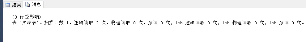 SET STATISTICS IO ON GO SELECT * FROM 买家表 GO SET STATISTICS IO OFF GO