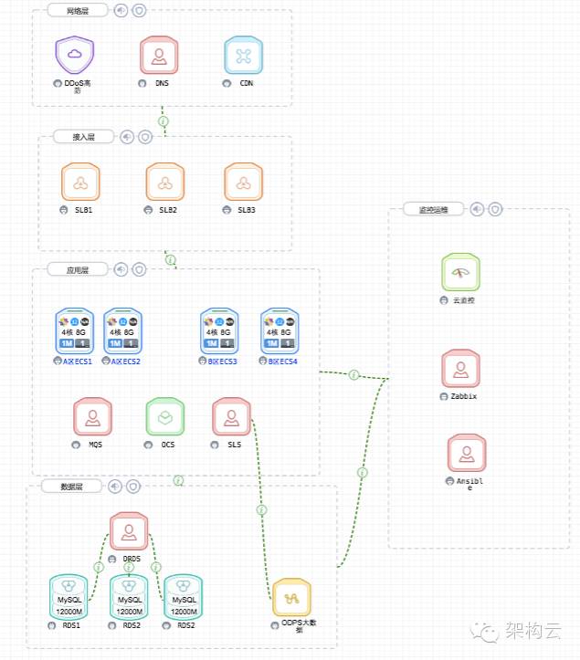 运维监控:云监控和Zabbix结合来实现整个系统从云资源到应用到业务的监控。Ansible用于自动化部署;