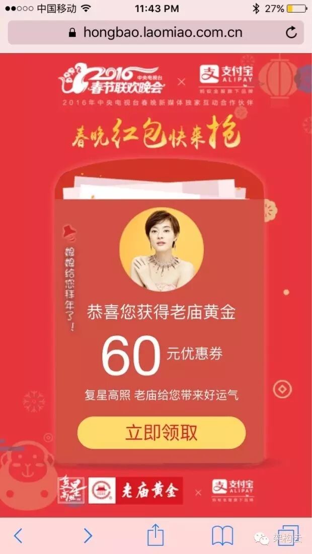 大致流程如下:用户点击支付宝咻一咻,会随机出现老庙红包界面,然后点击打开红包则由服务端随机返回一个不同额度的优惠券,然后用户通过优惠券id进行实体店或者网店的消费。效果图如下: