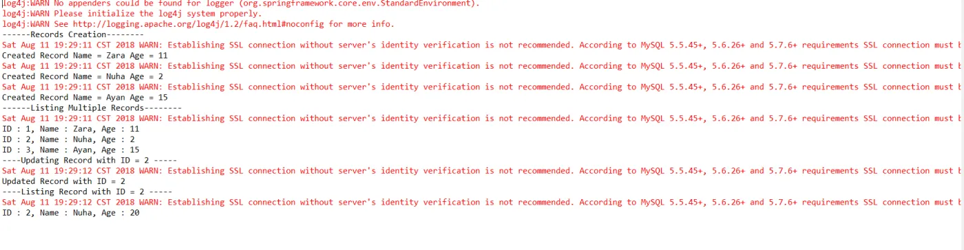 package com.tutorialspoint; import java.util.List; import org.springframework.context.ApplicationContext; import org.springframework.context.support.ClassPathXmlApplicationContext; public class MainApp { public static void main(String[] args) { ApplicationContext context = new ClassPathXmlApplicationContext("Beans.xml"); StudentJDBCTemplate studentJDBCTemplate = (StudentJDBCTemplate)context.getBean("studentJDBCTemplate"); System.out.println("------Records Creation--------" ); studentJDBCTemplate.create("Zara", 11); studentJDBCTemplate.create("Nuha", 2); studentJDBCTemplate.create("Ayan", 15); System.out.println("------Listing Multiple Records--------" ); List<Student> students = studentJDBCTemplate.listStudents(); for (Student record : students) { System.out.print("ID : " + record.getId() ); System.out.print(", Name : " + record.getName() ); System.out.println(", Age : " + record.getAge()); } System.out.println("----Updating Record with ID = 2 -----" ); studentJDBCTemplate.update(2, 20); System.out.println("----Listing Record with ID = 2 -----" ); Student student = studentJDBCTemplate.getStudent(2); System.out.print("ID : " + student.getId() ); System.out.print(", Name : " + student.getName() ); System.out.println(", Age : " + student.getAge()); } }
