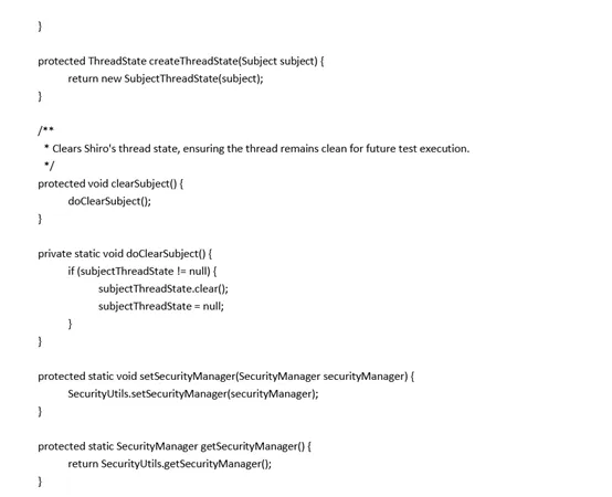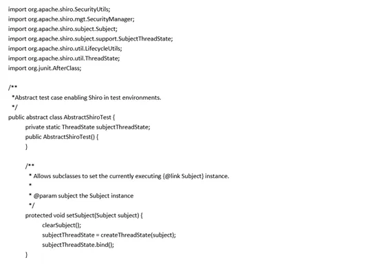 在 AbstractShiroTest 类中的代码使用 Shiro 的 ThreadState 概念及一个静态的 SecurityManager。这些技术在测试和框 架代码中是很有用的,但几乎不曾在应用程序代码中使用。 大多数使用 Shiro 工作的需要确保线程的一致性的终端用户,几乎总是使用 Shiro 的自动管理机制,即 Subject.associateWith 和 Subject.execute 方法。这些方法包含在 Subject thread association 参考文献中。