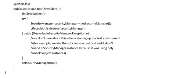 正如你所看到的,一个具体的 SecurityManager 实现被实例化,并通过 setSecurityManager 方法使其余的测试能够对 其进行访问。然后测试方法能够使用该 SecurityManager,当使用 Subject.Builder 后通过调用 getSecurityManager()方 法。 还要注意 SecurityManager 实例在@BeforeClass 设置方法中只被设置一次——一个对于大多数测试类较为普遍的做 法。如果你想,你可以创建一个新的 SecurityManager 实例并在任何时候从任何测试方法通过 setSerurityManager 来 设置它——例如,你可能会引用两个不同的.ini 文件来构建一个根据你的测试需求而来的新 SecurityManager。 最后,与单元测试例子一样,AbstractShiroTest 超类将会清除所有 Shiro 产物(任何存在的 SecurityManager 及 Subject 实例)通过它的@AfterClass tearDownShiro()方法来确保该线程在下个测试类运行时是'clean'的。