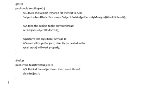 在实例中的 tearDownSubject()方法使用了 Junit 4 的注释来确保该 Subject 在每个测试方法执行后被清除,不管发生 什么。这要求你设立一个新的 Subject 实例并将它设置到每个需要执行的测试中。 然而这也不是绝对必要的。例如,你可以只每个测试开始时绑定一个新的 Subject 实例(通过 setSubject),也就是 说,使用@Before-annotated 方法。但如果你将要这么做,你可以同时使用@After tearDownSubject() 方法来保持对 称及'clean'。 你可以手动地在每个方法中混合及匹配该 setup/teardown 逻辑或使用@Before 和@After 注释只要你认为合适。所有 测试完成后,AbstractShiroTest 超类在无论怎样都会将 Subject 从线程解除绑定,因为@After 注释在它的 tearDownShiro()方法中。