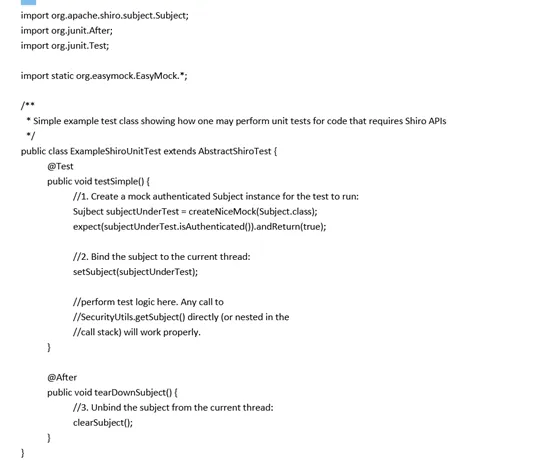由于单元测试适用于测试你的逻辑(而不是你可能调用的任何实现),这对于模拟你逻辑所依赖的任何 API 来说是 个很好的主意。这能够与 Shiro 工作得很好——你可以模拟 Subject 实例,并使它反映任何情况下你所需的反应,这 些反应是处于测试的代码做出的。 但正如上文所述,在 Shiro 测试中关键是要记住在测试执行期间任何 Subject 实例(模拟的或真实的)必须绑定到线 程。因此,我们所需要做的是绑定模拟的 Subject 以确保如预期进行。 (这个例子使用 EasyMock,但 Mockito 也同样地工作得很好):