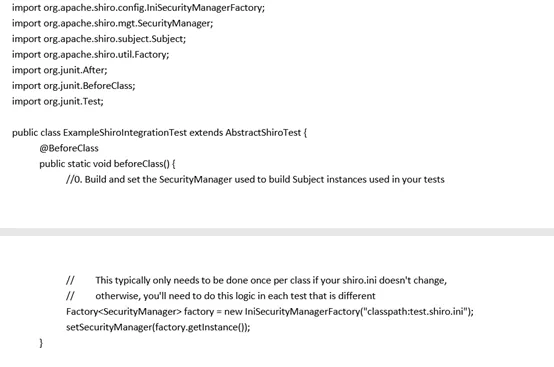 ExampleShiroIntegrationTest 下面的实例代码看起来与上面的单元测试实例几乎相同,但这 3 个步骤却有些不同:
