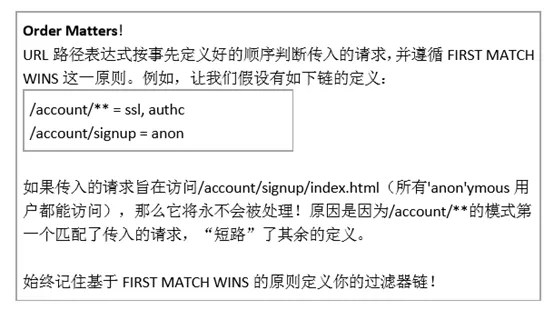 此行表明,“任何对我应用程序的/accout 或任何它的子路径(/account/foo, account/bar/baz,等等)的请求都将触 发'ssl, authc'过滤器链”。我们将在下面讨论过滤器链。 请注意,所有的路径表达式都是相对于你的应用程序的上下文根目录而言的。这意味着如果某一天你在某个位置部 署了你的应用程序,如 www.somehost.com/myapp ,然后又将它部署到了 www.anotherhost.com (没有'myapp'子 目录),这样的匹配模式仍将继续工作。所有的路径都是相对于 HttpServletRequest.getContextPath()的值来的。