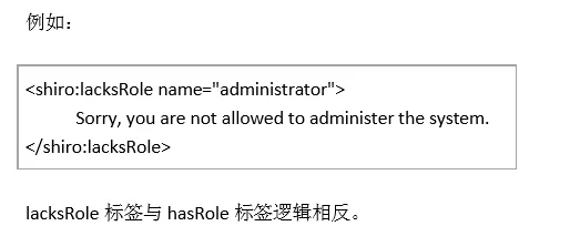 lacksRole 标签将会显示它所包含的内容,仅当当前 Subject 未被分配具体的角色。